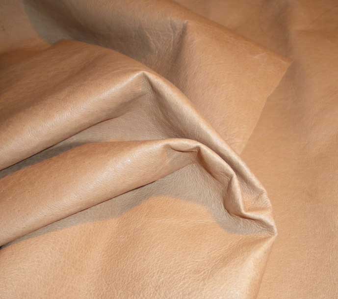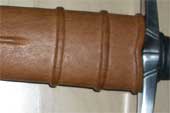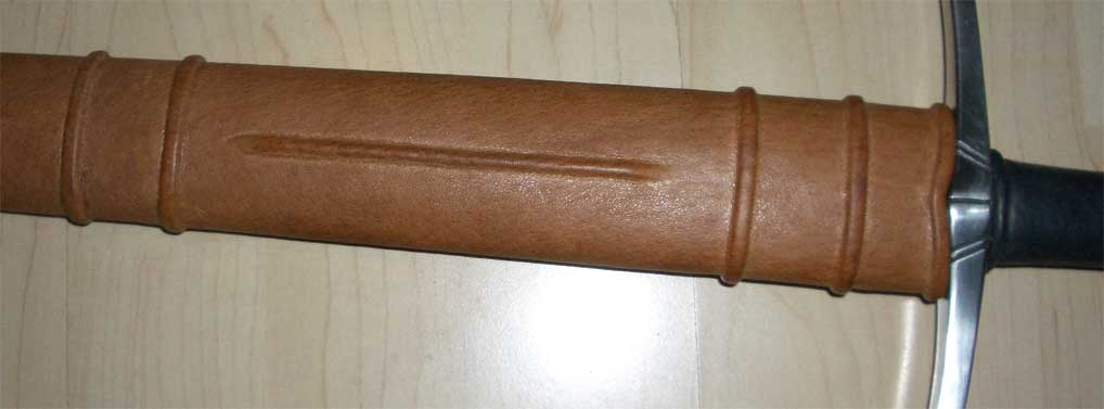 Das Leder für den Überzug muß mehreren Ansprüchen gleichzeitig gerecht werden. Zum einen muß es robust genug sein um eine längere Zeit an einer Scheide zu überleben (die Schwertscheiden schlagen schließlich permanent an Rüstungsteile), aber es muß auch gleichtzeitg flexibel genug sein um sich den Formen der Holzscheiden anzupassen. Als Kompromiss sollte man am besten ein Glattleder mit einer Stärke von 1-2mm wählen (dies hängt natürlich auch von der Gerbung ab und das Leder kann vor dem Aufbringen durch walken auch noch etwas flexibler gemacht werden.). Durch die Klebschicht unter dem Leder wird es nach dem Kleben noch erheblich steifer. Eine relativ gerade, unverzierte Scheide kann mit etwas dickerem Leder überziehen, als eine stark gekrümmte bzw. eine mit einem Relief verzierte Scheide (siehe unten).