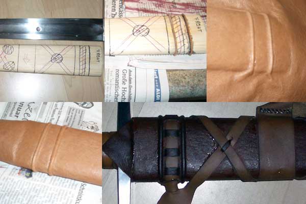 Bevor das Leder aufgezogen wird können noch verschiedene Muster auf die Holzscheide angebracht werden. Beim Aufziehen des Leders drücken sich dann diese Muster durch und bleiben erhalten. Prinzipiell eigenen sich zwei verschiedene Materialien zur Auftragung auf die Holzscheide: Leder und Holz. Im gezeigten Beispiel sind die geraden, nicht gebogenen, Linien aus dünnen Holzleisten und die Umrandungen (gebogen um die Scheibe herum) aus Lederschnur. Beides wird vor dem Lederüberzeug aufgeklebt. Für kurze Strecken können zum Beispiel lange Schaschlikspieße (einseitig leicht angeschliffen für eine bessere Klebefläche) verwendet werden.